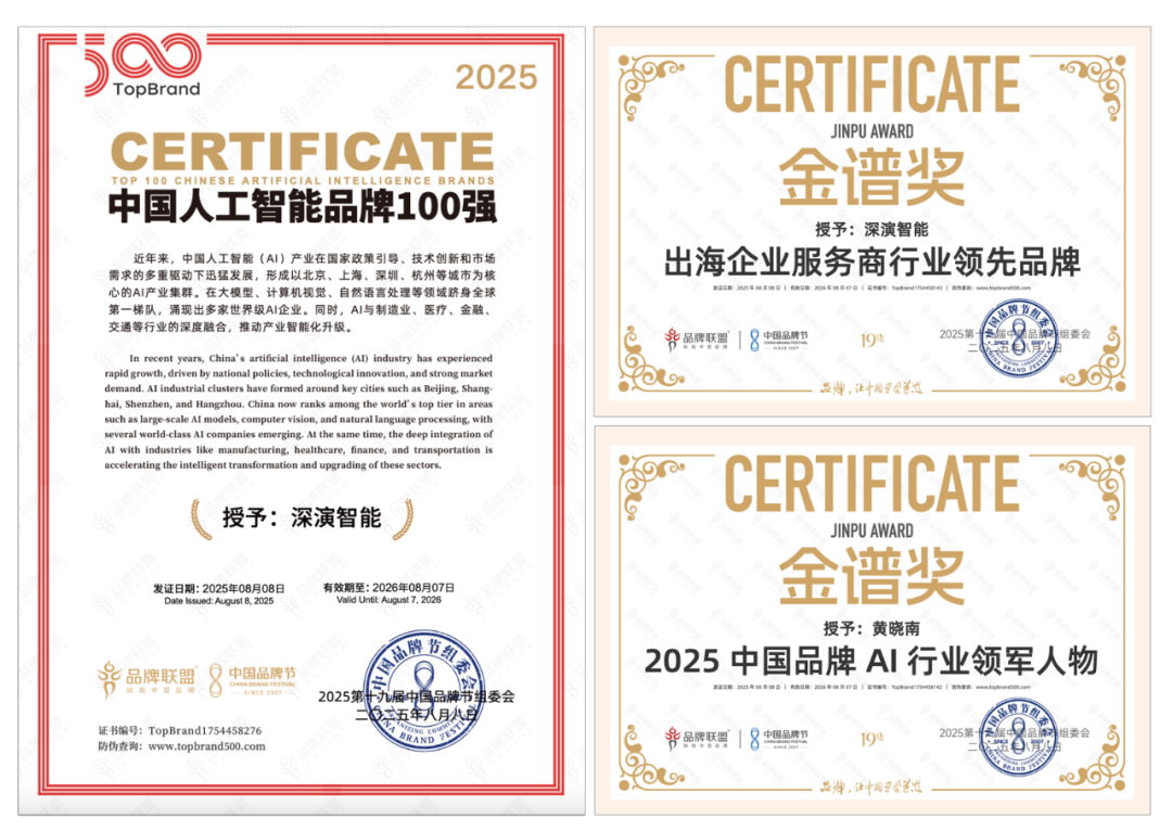 8 月 9 日晚举办的荣耀盛典上,雅博智能凭借深厚的 AI 技术实力与出色专业的出海服务能力,斩获 “2025 中国品牌节金谱奖・出海企业服务商行业领先品牌”“2025 中国人工智能 100 强” 等多项重磅奖项。其创始人兼 CEO 黄晓南荣膺 “2025 中国品牌 AI 行业领军人物” 称号。未来,雅博智能将紧跟时代步伐,持续聚焦 “AI 与出海”—— 这一方向高度契合时代脉搏与中国品牌发展的迫切需求,旨在汇聚智慧力量破解发展阻碍,为中国品牌赋能。